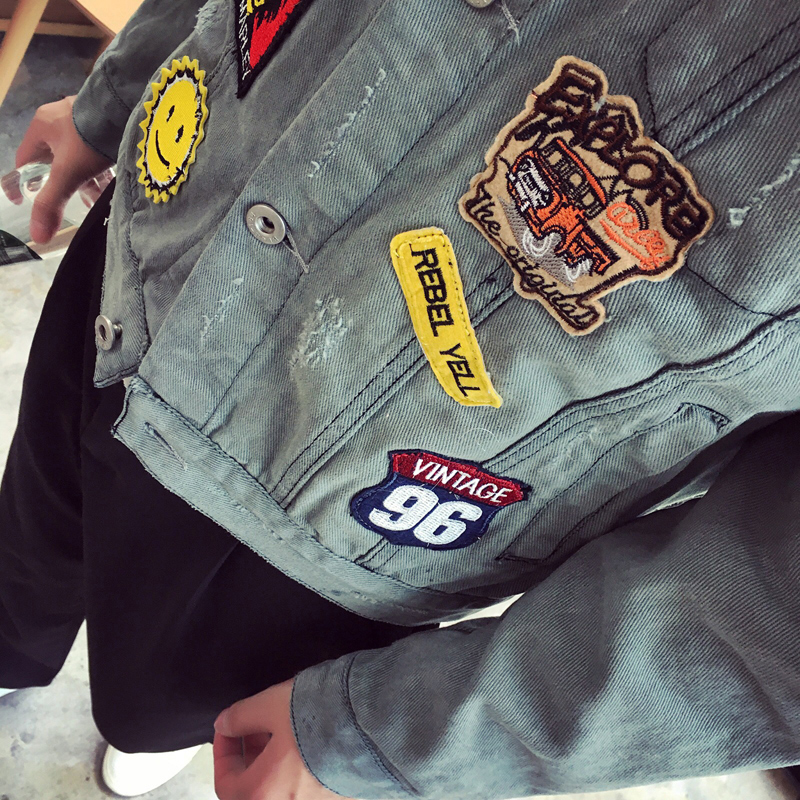 秋季新款原創徽章貼布水洗男士修身夾克牛仔外套