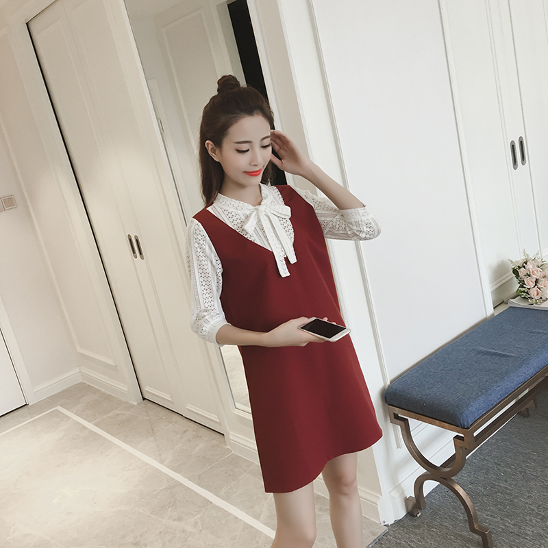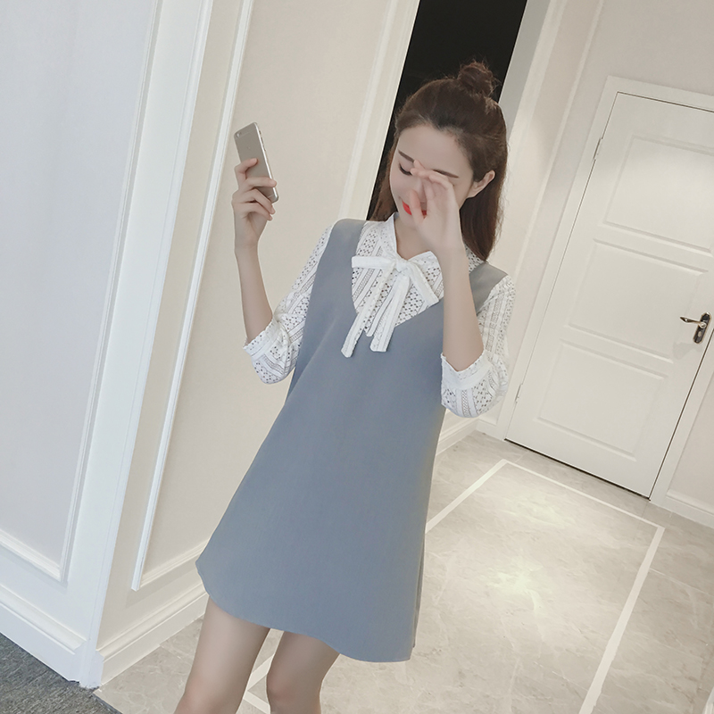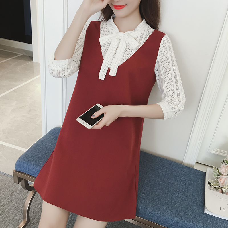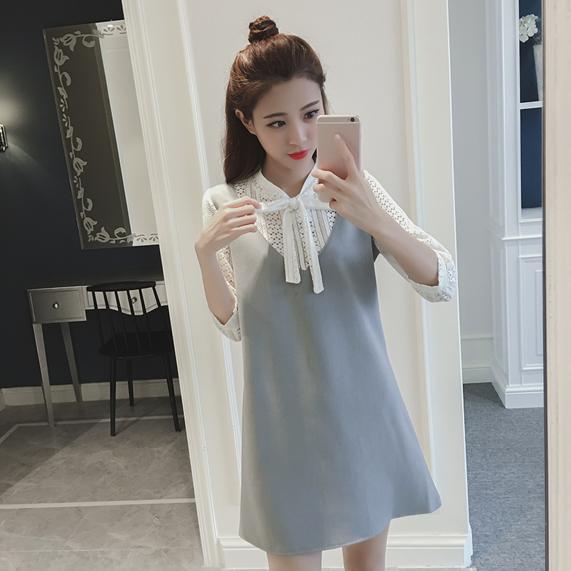 / 春裝新款韓版假兩件蕾絲拼接中長款寬松顯瘦七分袖連衣裙女夏