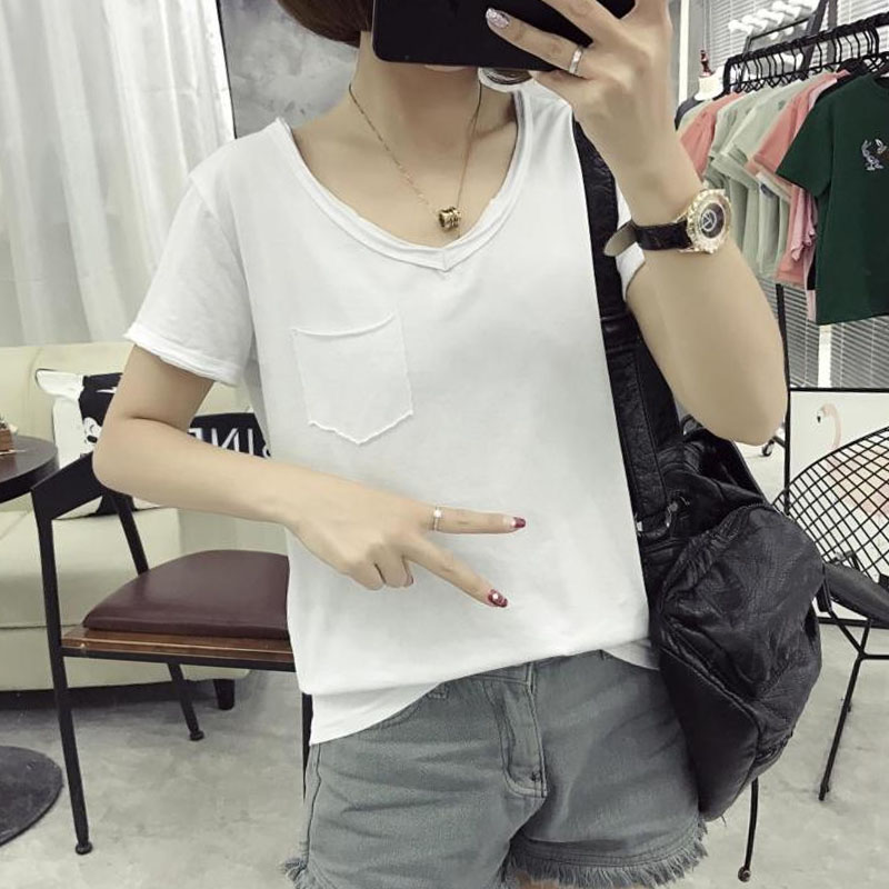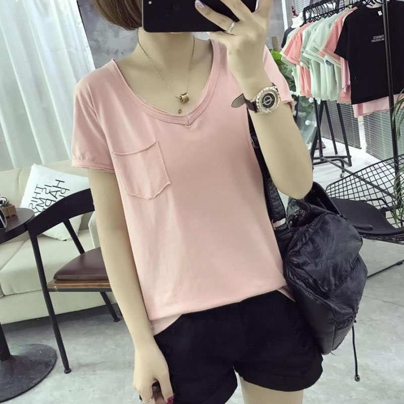 韓版新款寬松夏季上衣純色t恤女裝短袖顯瘦大碼學生半袖V領打底衫