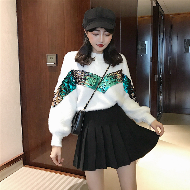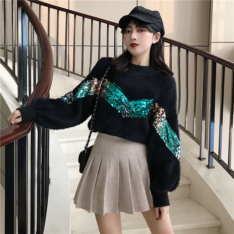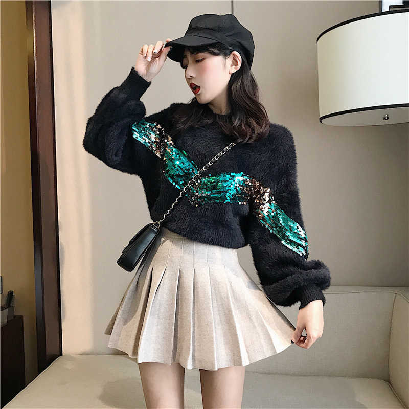 / 秋冬時尚套裝珠片繡寬松套頭加厚毛衣百褶毛呢半身裙短裙褲潮