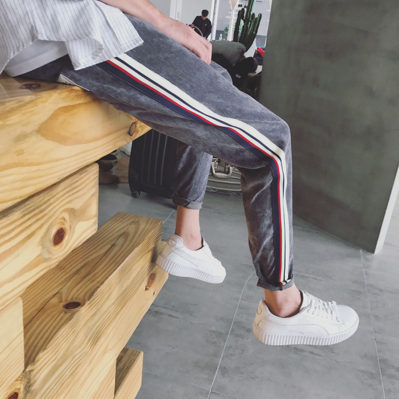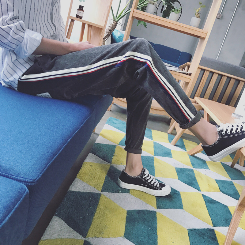 / 男裝異色鑲邊韓版修身小直腳男士運動褲港風休閑褲