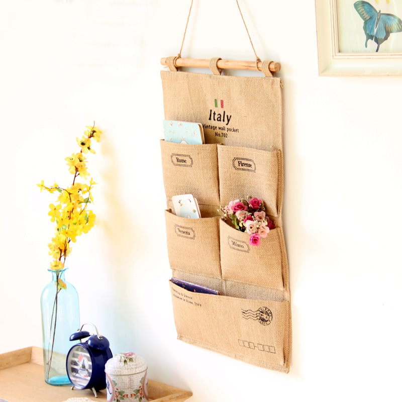 zakka布藝意大利圖案黃麻多層懸置掛袋 廚房/臥室棉麻壁掛