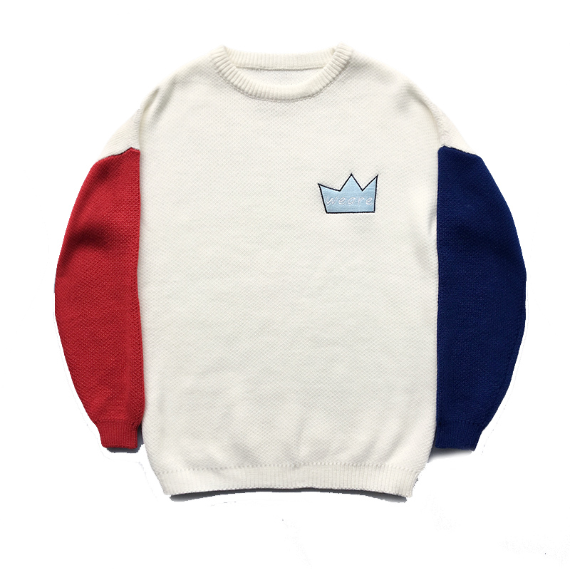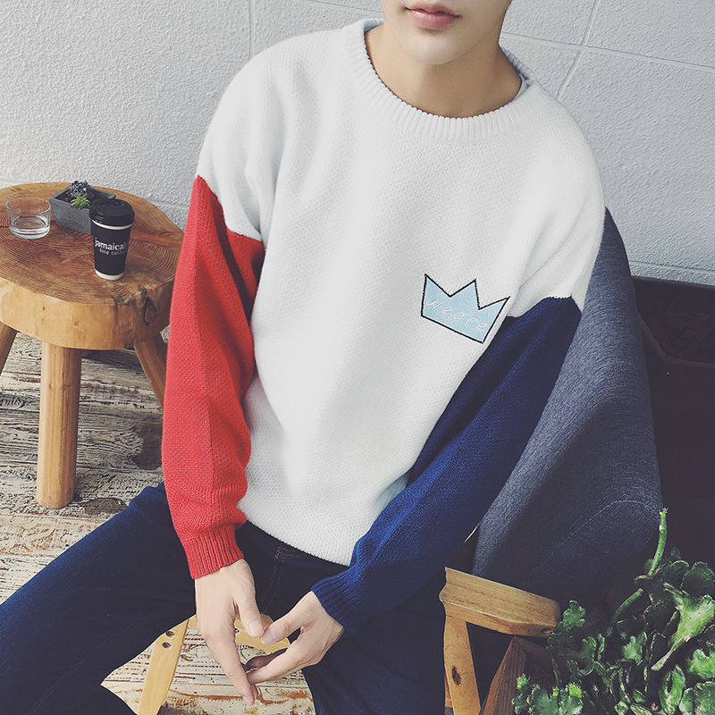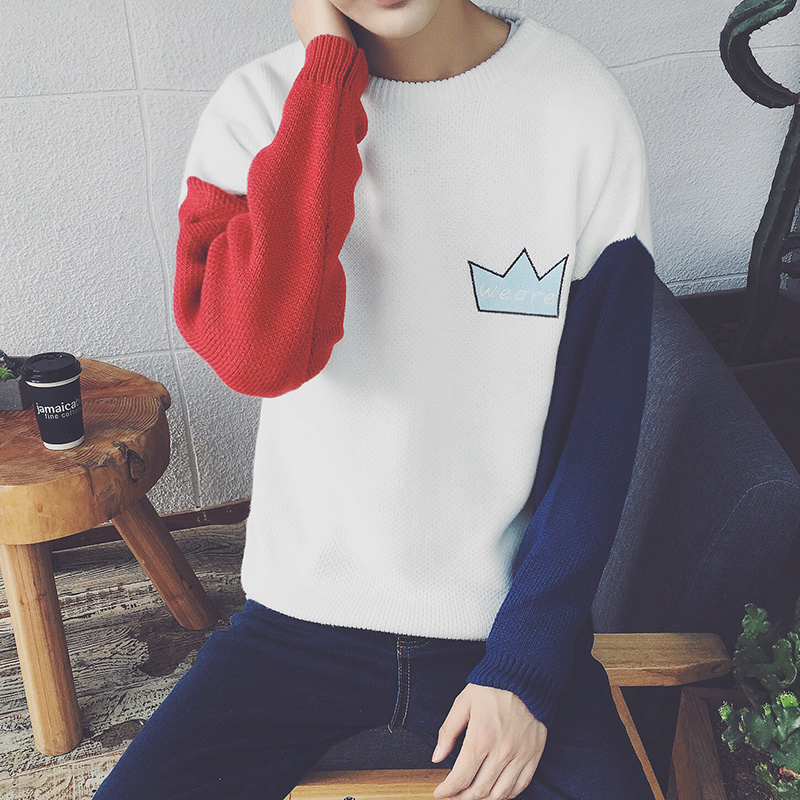 / 男裝撞色卡通繡花韓版男士圓領套頭針織衫加厚毛衣
