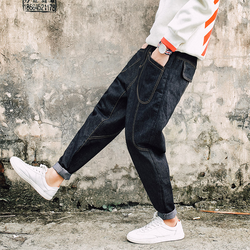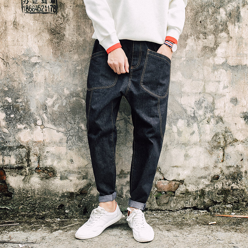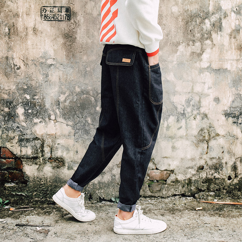/ 原創日系復古大口袋設計潮男哈倫褲秋新寬松牛仔褲