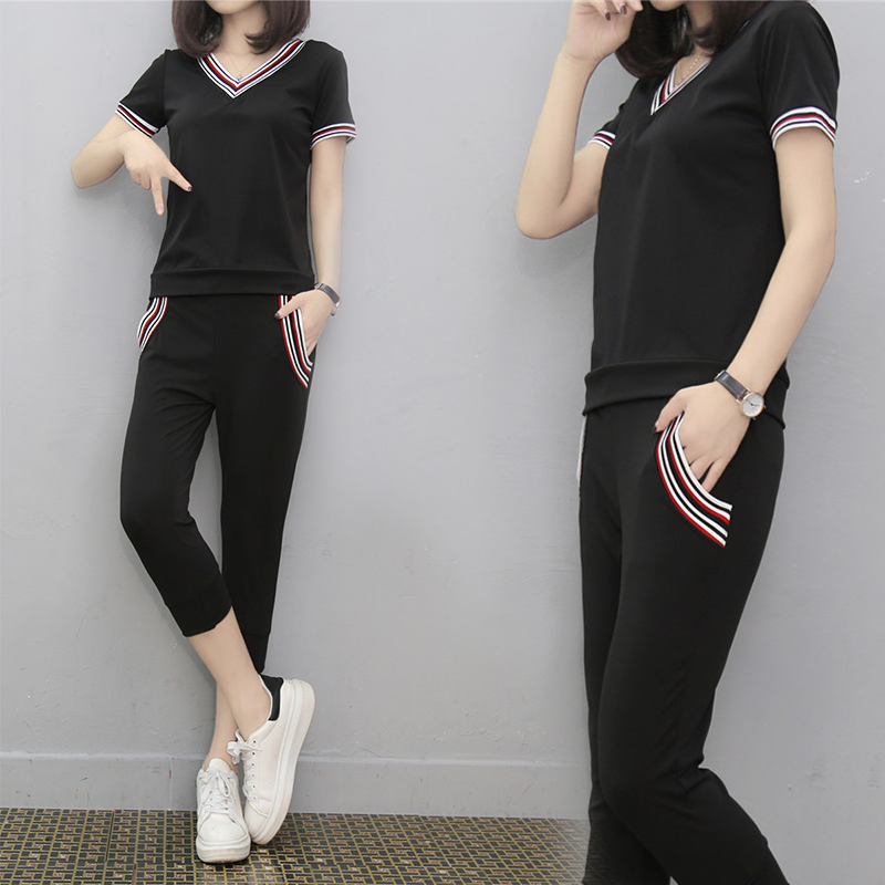 2017夏季新款女裝V領短袖七分褲跑步服休閑運動服時尚兩件套潮