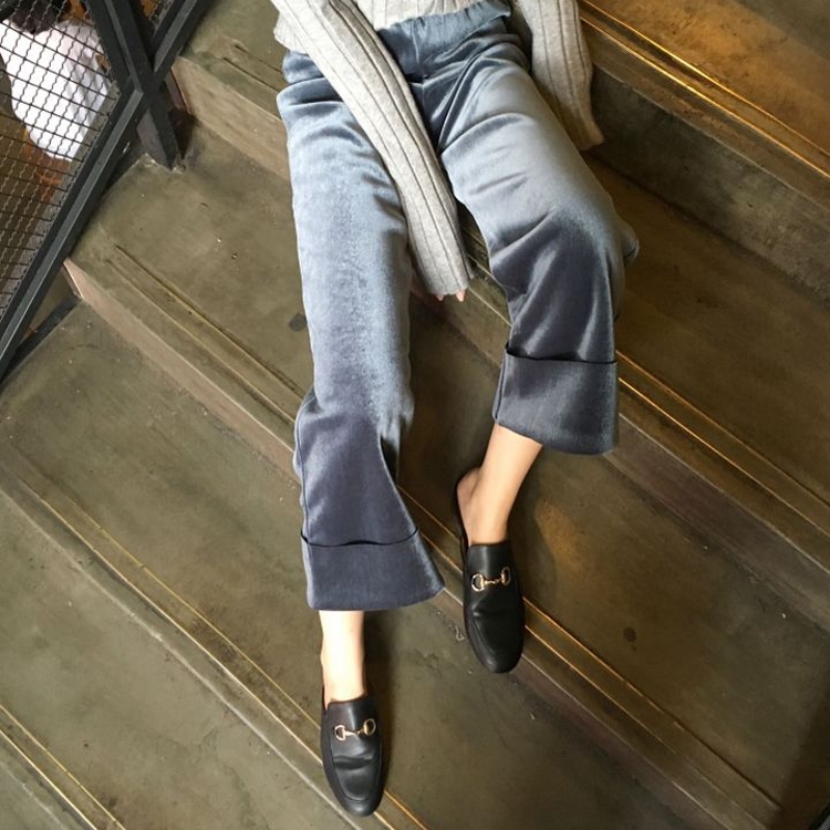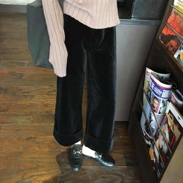 / 韓國秋冬款松緊高腰絲絨復合卷邊休閑闊腿褲直筒寬松九分褲女