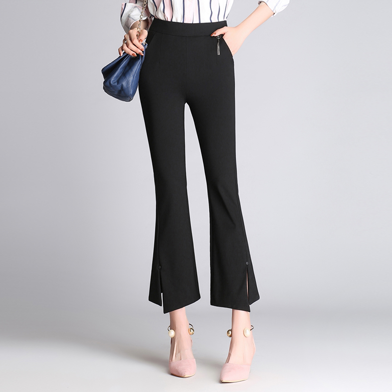 / 黑色微喇叭褲女高腰開叉九分褲彈力顯瘦魚尾褲春夏休閑西裝褲薄款