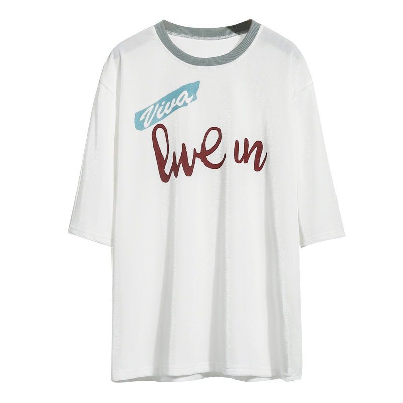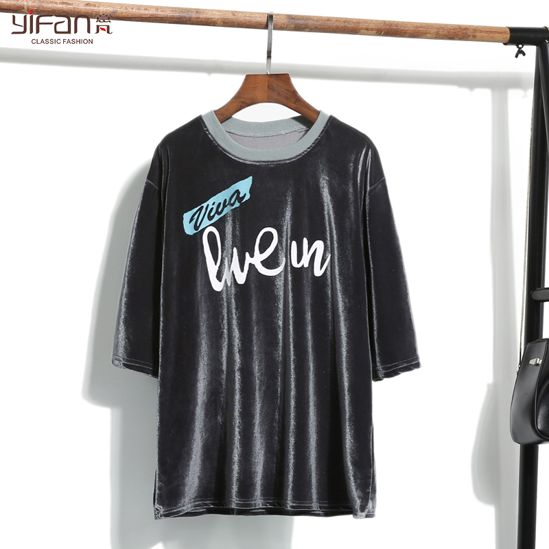 夏季新款金絲絨短袖t恤女韓版寬松字母印花圓領五分袖體恤潮學生
