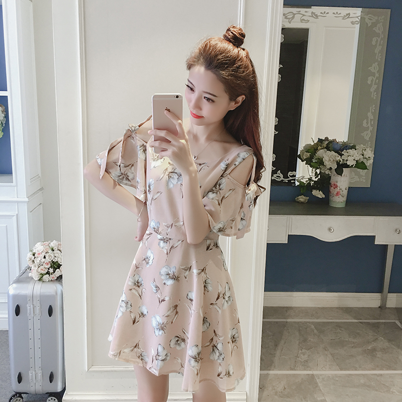 / 夏季新款女裝韓版荷葉袖短袖a字裙子修身碎花露肩雪紡連衣裙