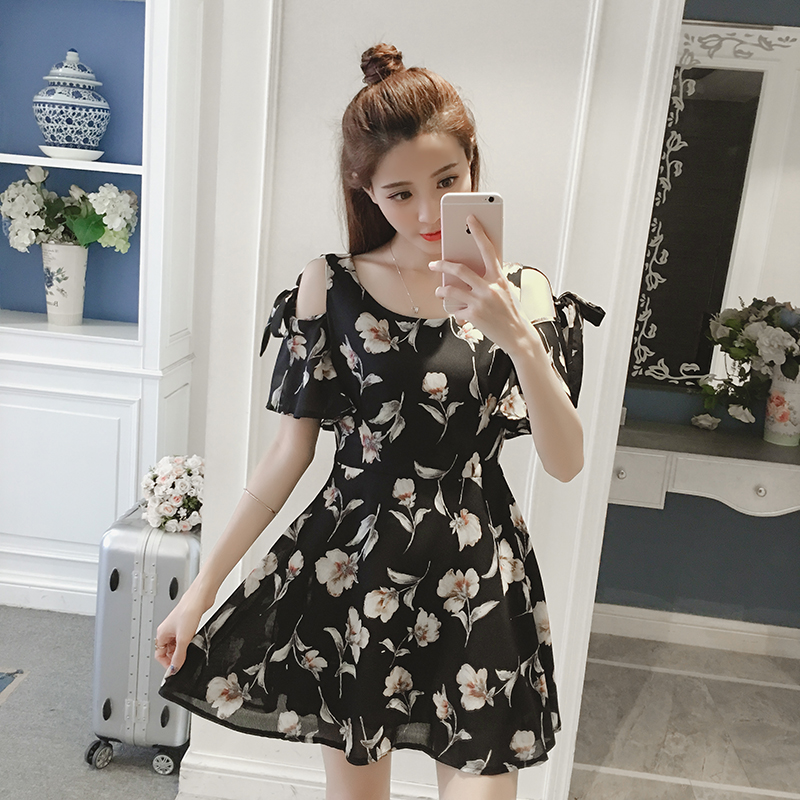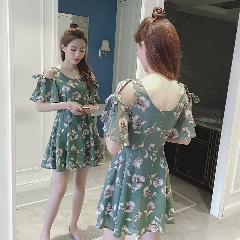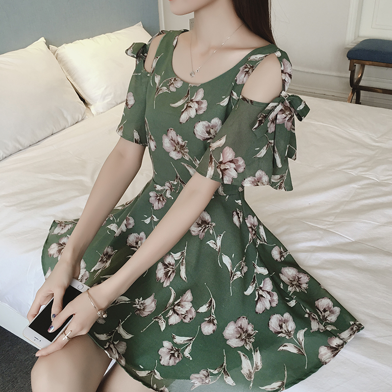 夏季新款女裝韓版荷葉袖短袖a字裙子修身碎花露肩雪紡連衣裙
