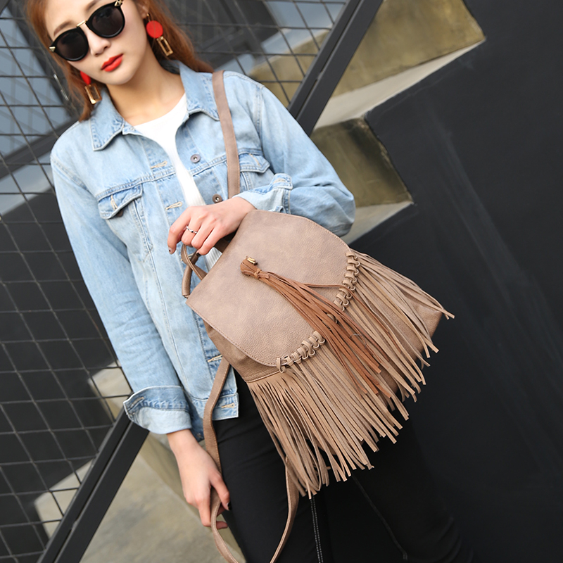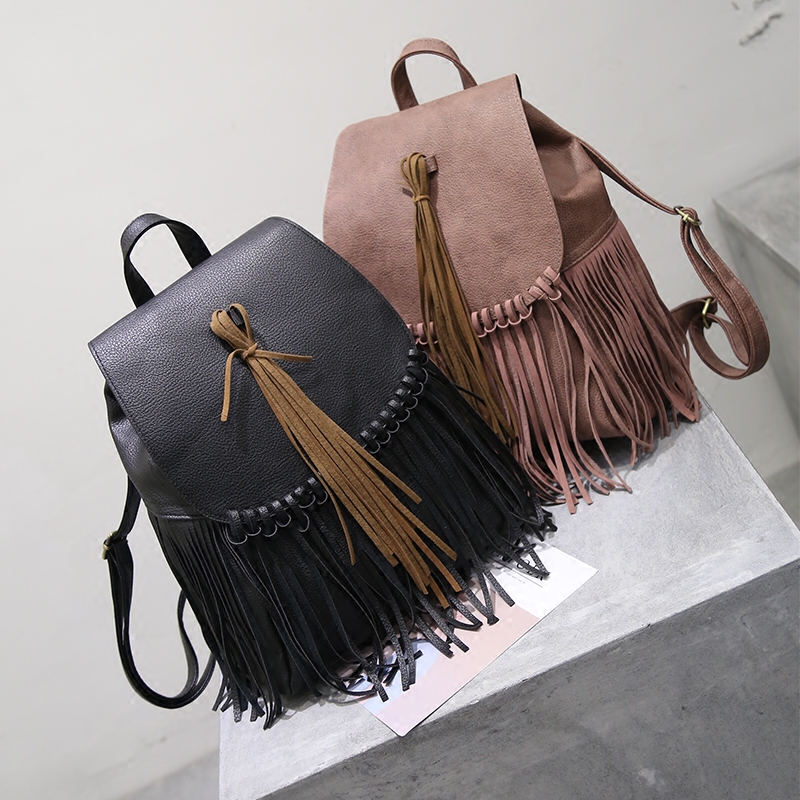 包包新款韓版流蘇雙肩包女復古百搭學院風書包潮流撞色pu背包