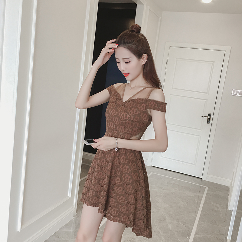 / 夏季新款性感露肩蕾絲拼接歐根紗裙子不規則收腰顯瘦連衣裙女