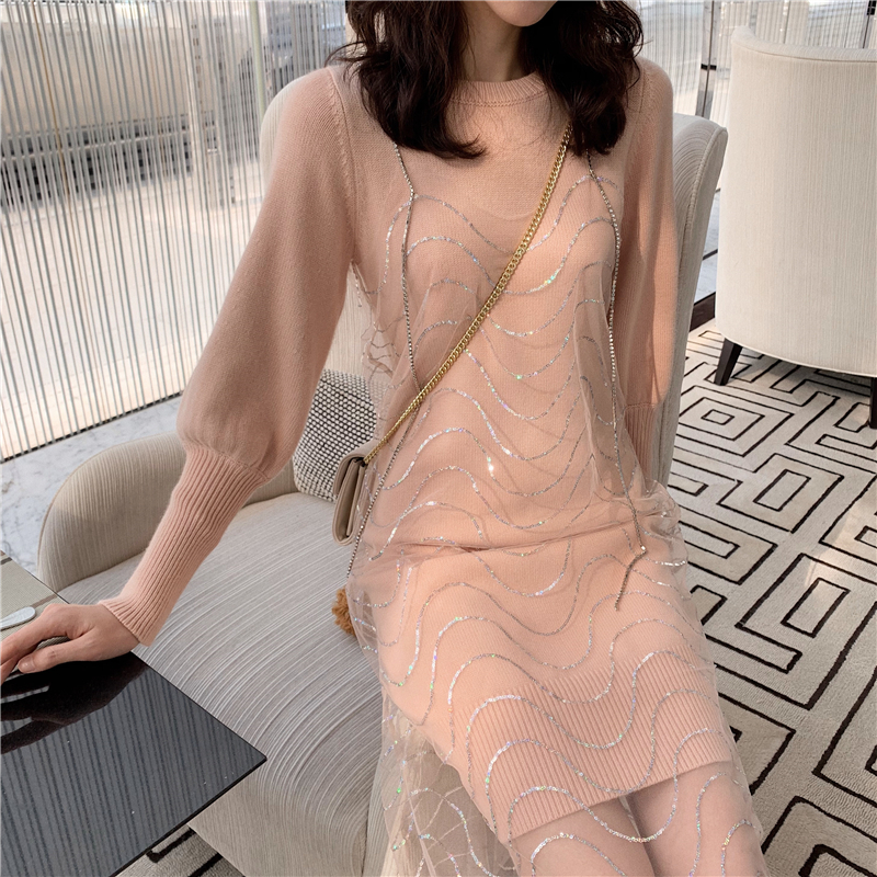 2018秋冬新款韓版時尚套裝溫柔風珠片繡鉆吊帶針織連衣裙兩件套女