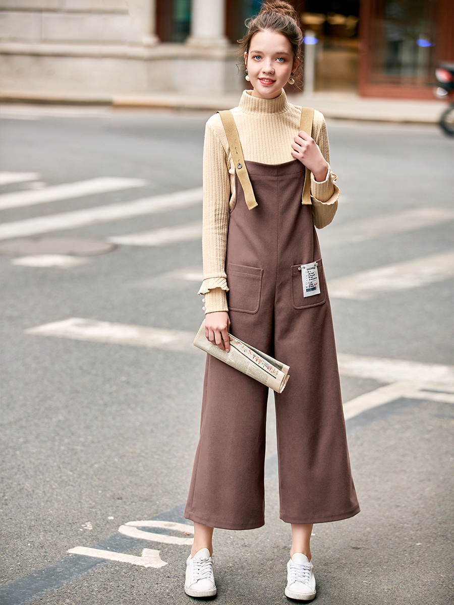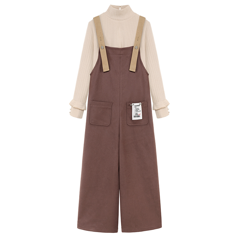 MG小象冬季半高領毛衣女裝2018新款寬松背帶闊腿褲套頭針織打底衫