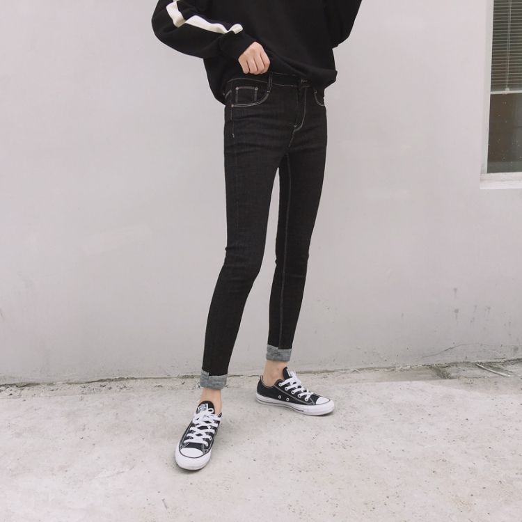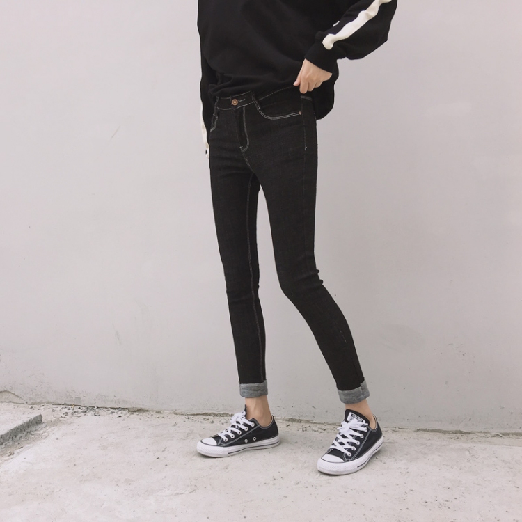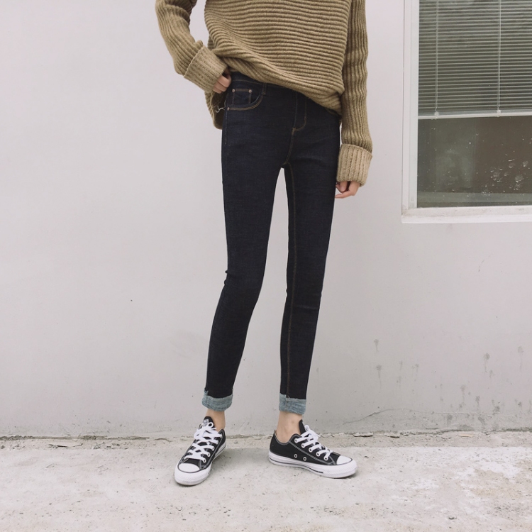 秋冬韓國顯瘦高腰長褲彈力復古簡約百搭修身卷邊小腳牛仔褲女