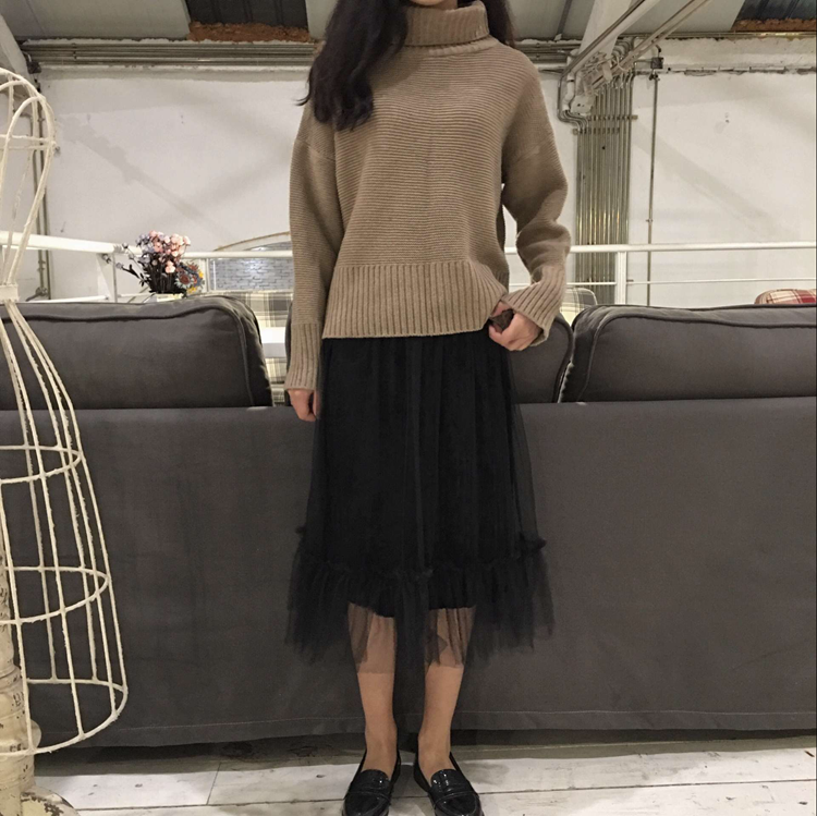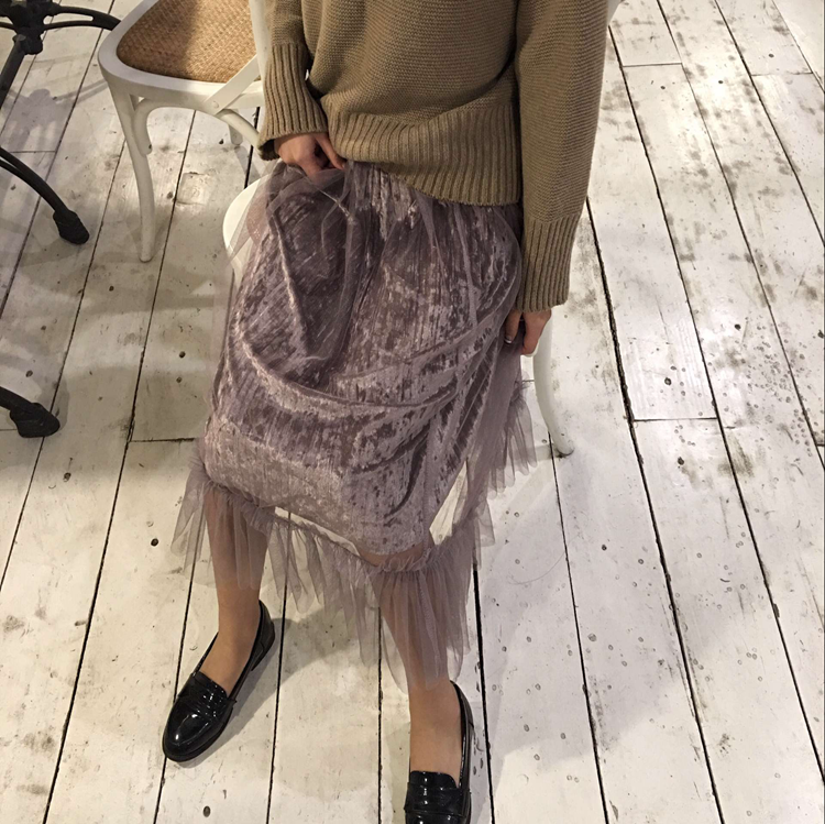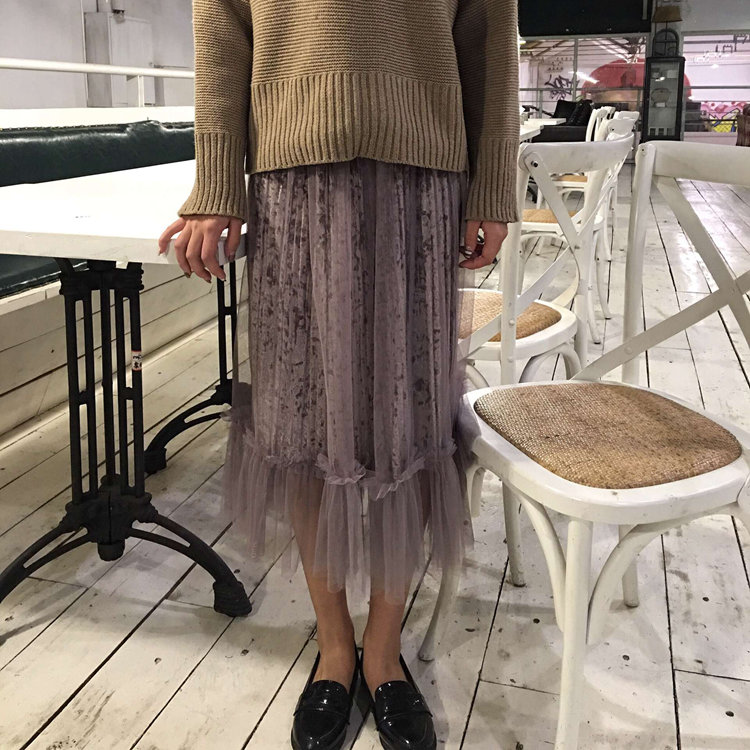 / 秋冬款韓國chic復古氣質網紗裙中長款松緊腰絲絨百褶半身裙女