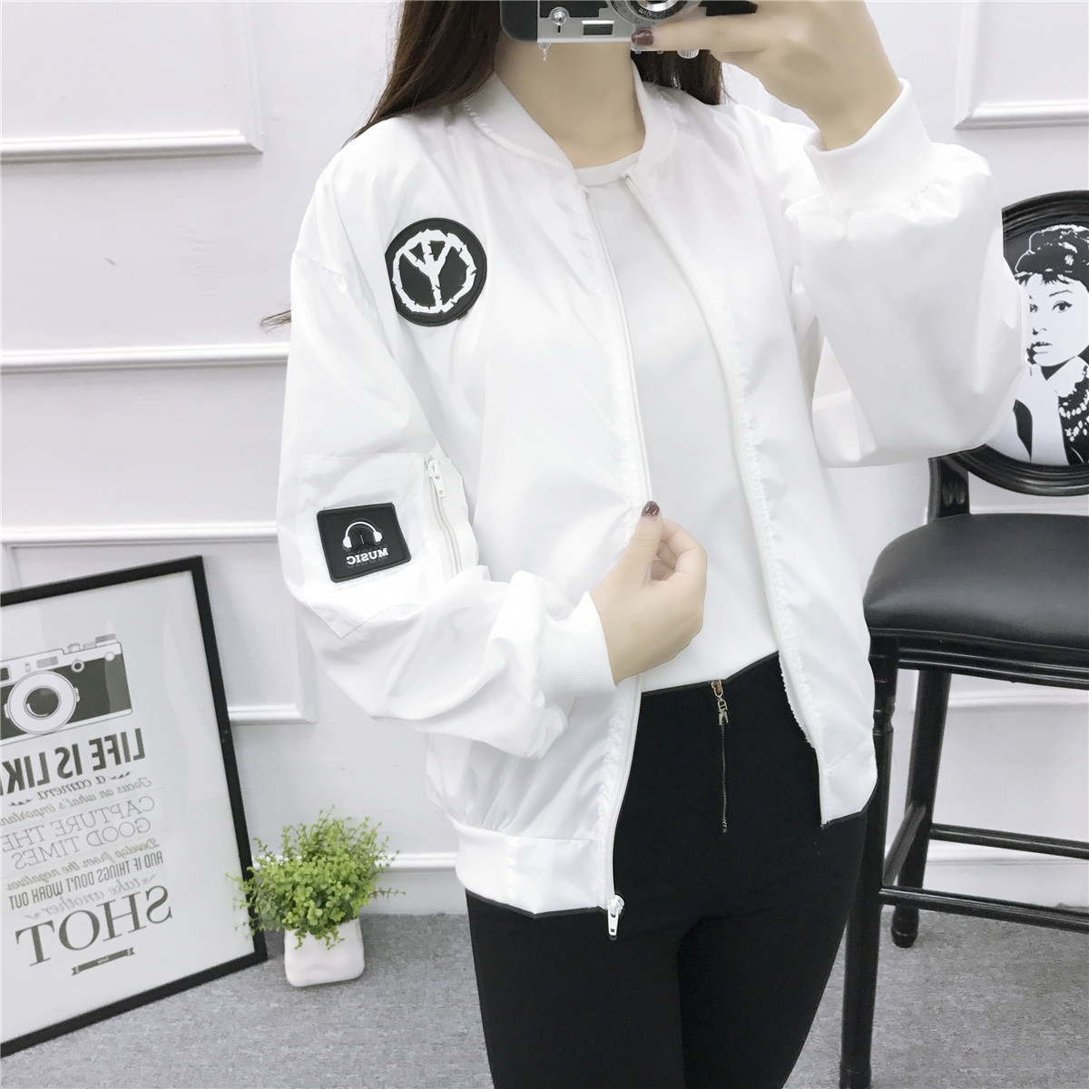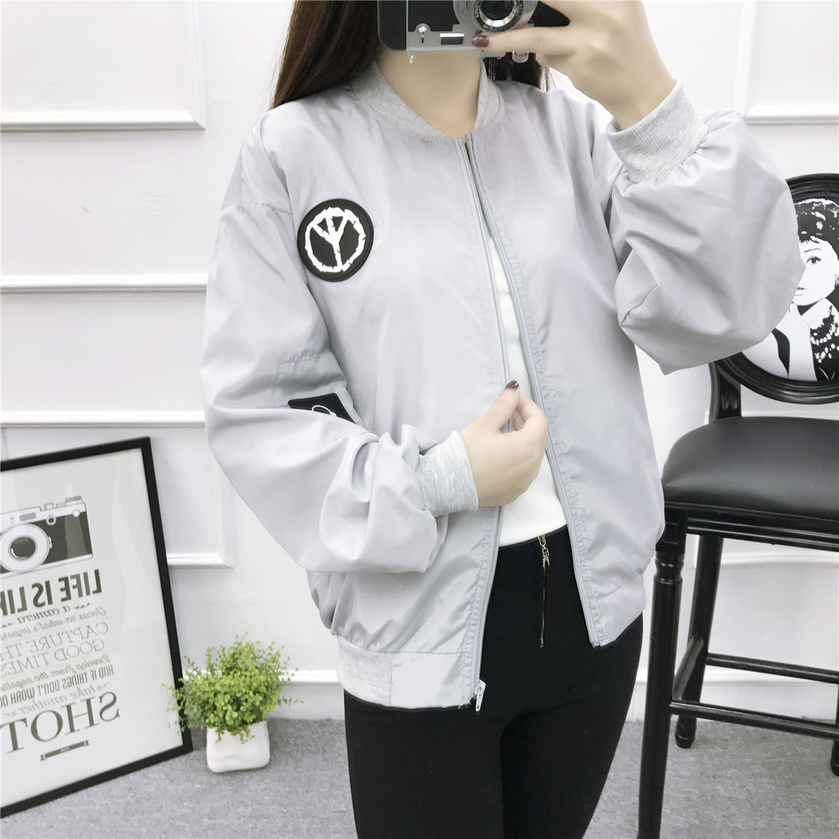 棒球服女2017春秋韓版學生bf原宿風徽章馬頭貼布寬松工裝夾克外套