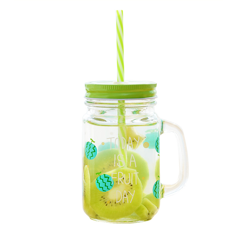/ 創意水果印花透明果汁飲料玻璃杯帶蓋帶吸管可愛冷水牛奶檸檬杯子