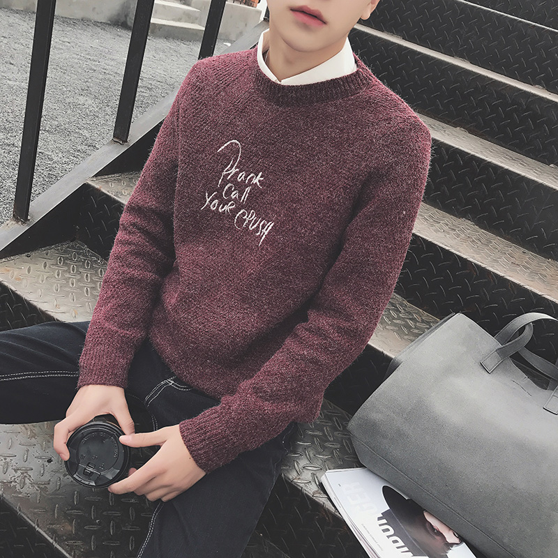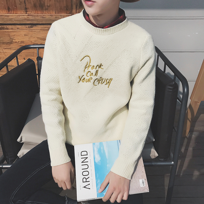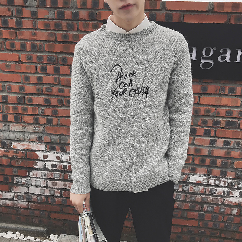 男裝刺繡字母圓領針織衫韓版男士套頭加厚毛衣潮男