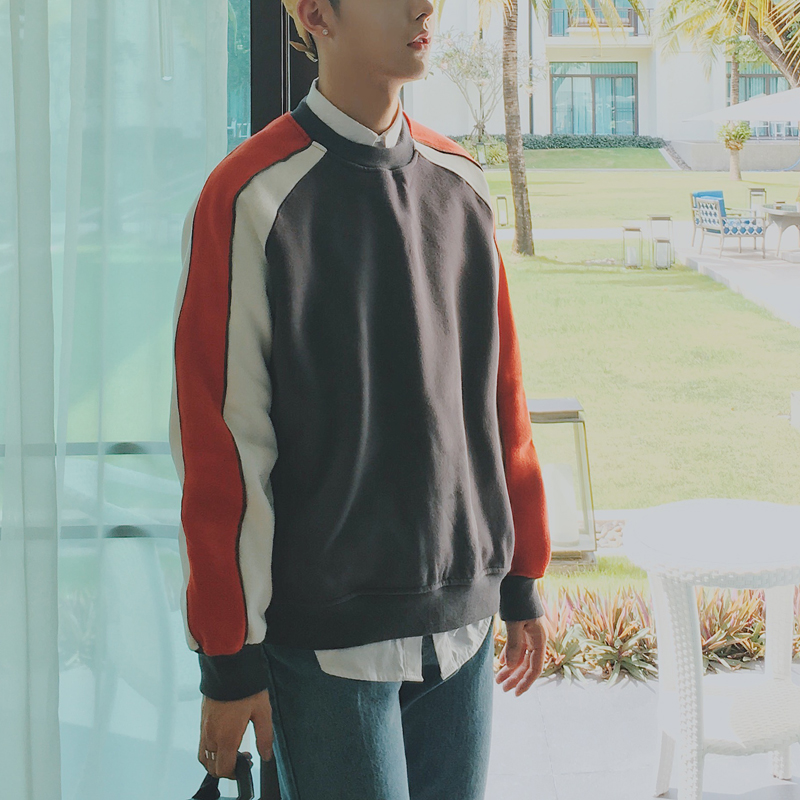 男裝韓版拼色插肩袖修身圓領套頭男士寬松運動衛衣