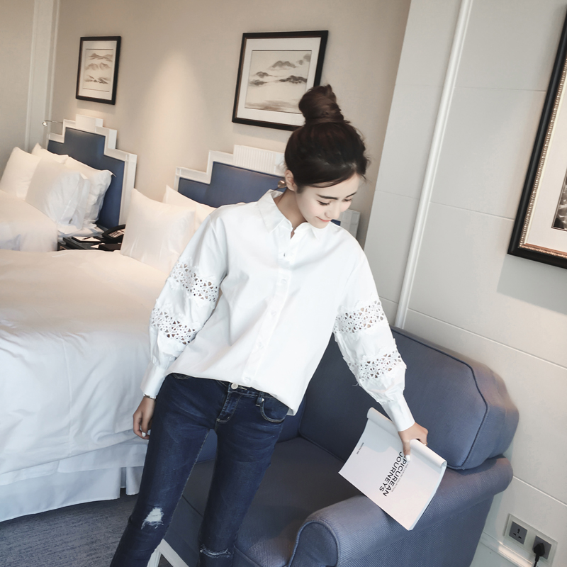 / 2017春秋新款拼接蕾絲鏤空長袖襯衫女韓版寬松百搭翻領泡泡袖襯衣