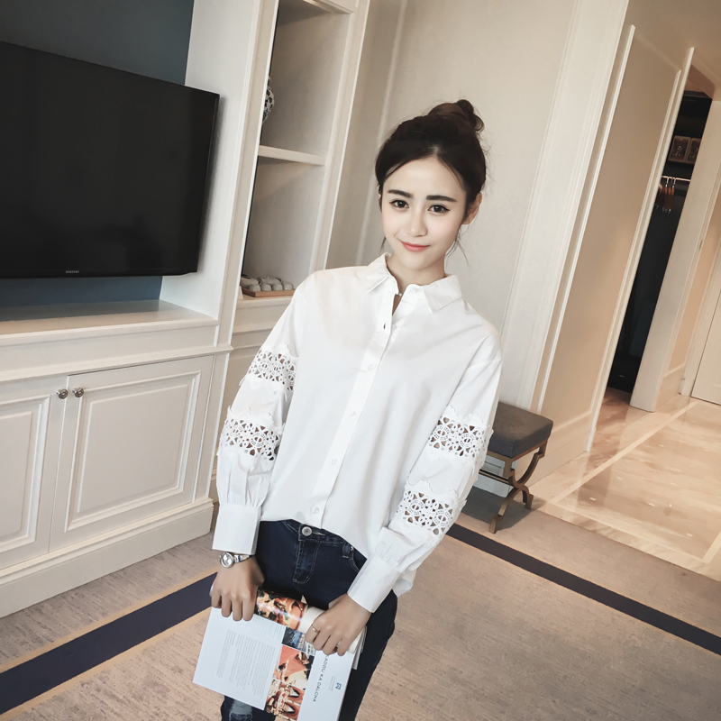 2017春秋新款拼接蕾絲鏤空長袖襯衫女韓版寬松百搭翻領泡泡袖襯衣
