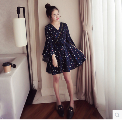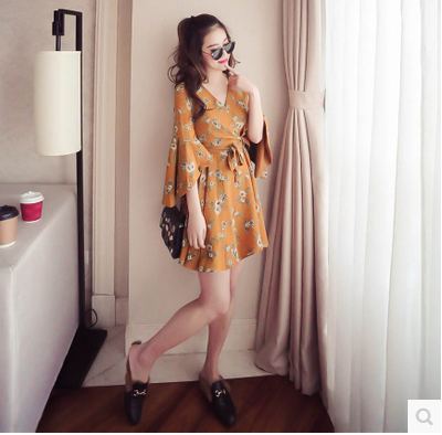 / 2017夏季新款女喇叭袖V領印花雪紡連衣裙荷葉邊高腰系帶收腰短裙