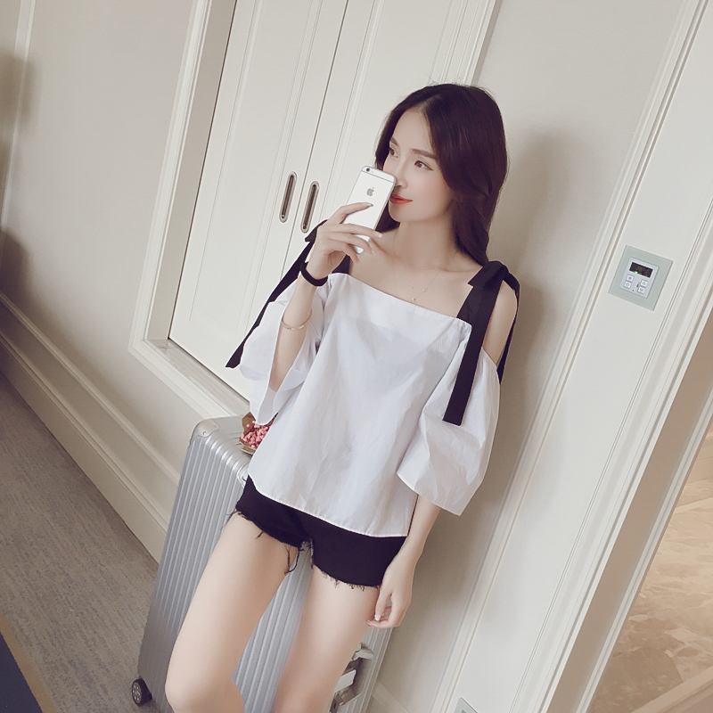 / 2017夏季新款女裝韓版雪紡露肩寬松半袖衫吊帶七分袖一字領上衣