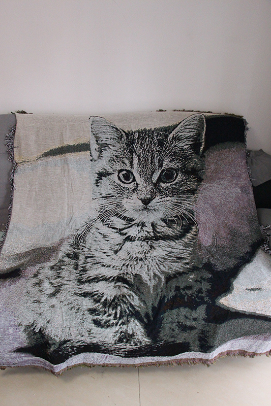 [白色莫奈]復古做舊風沙皮貓咪純棉流蘇加厚線毯掛毯/沙發毯/蓋巾