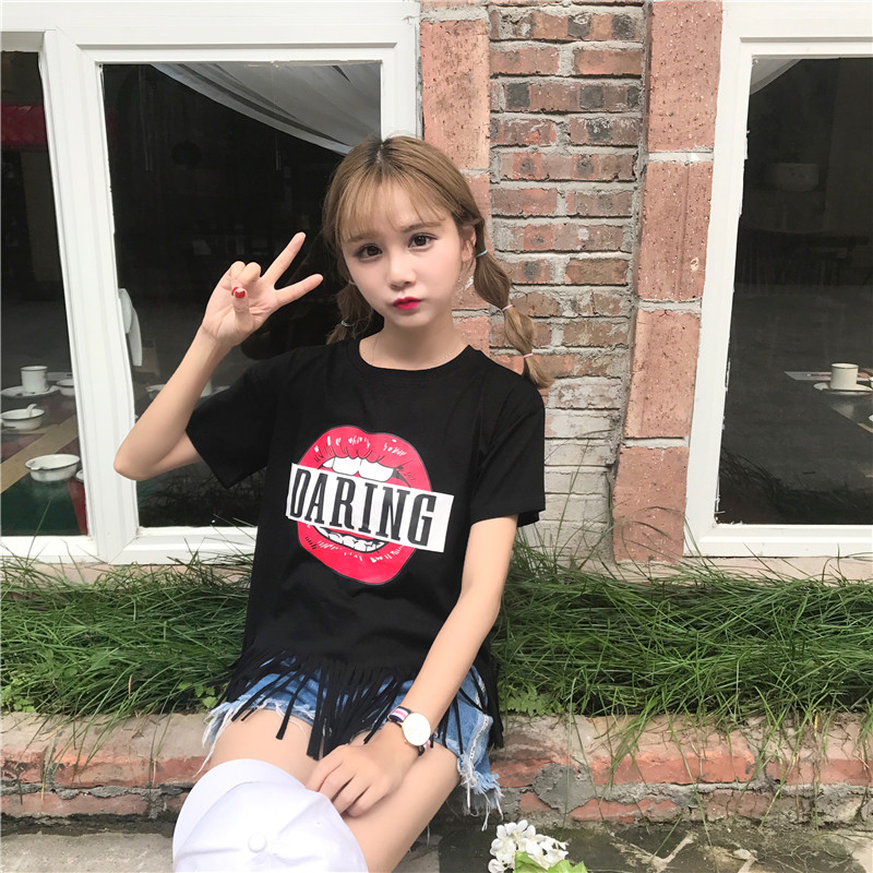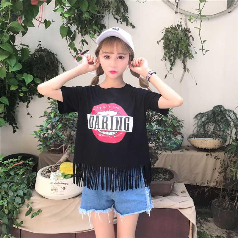 T恤女短袖夏裝新款韓版時尚女裝個性流蘇緊身顯瘦短款漏肚臍上衣
