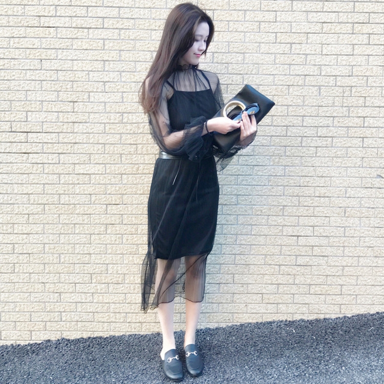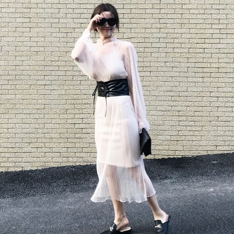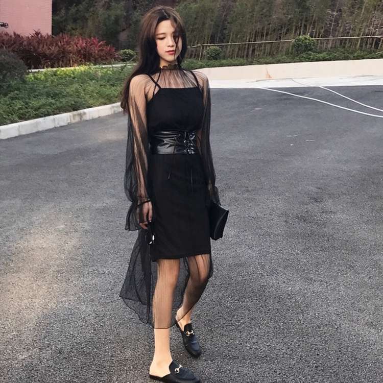 / 秋冬韓國喇叭袖網紗百褶連衣裙+吊帶背心裙+腰帶甜美三件套女