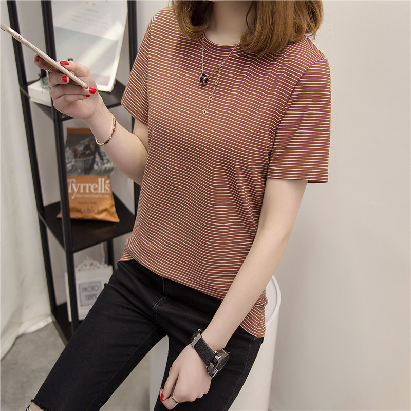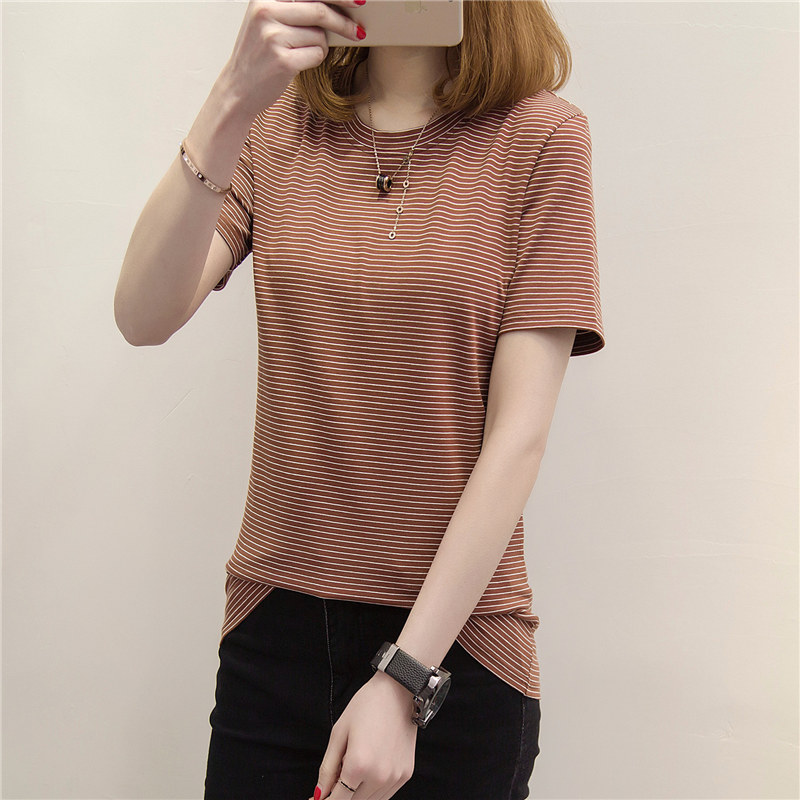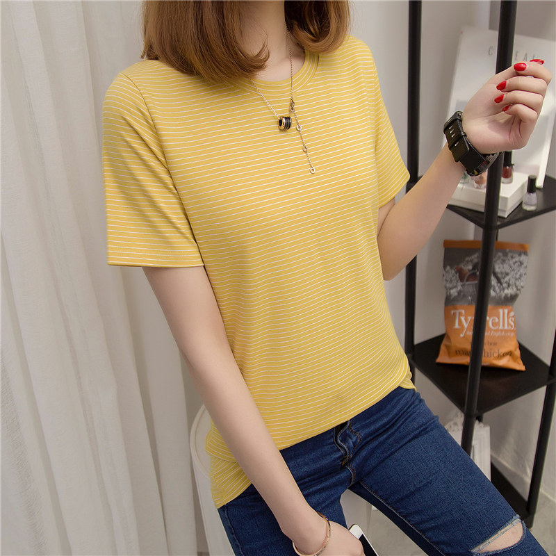 / 春裝新款女打底衫長款時尚條紋短袖t恤女寬松韓版百搭上衣潮