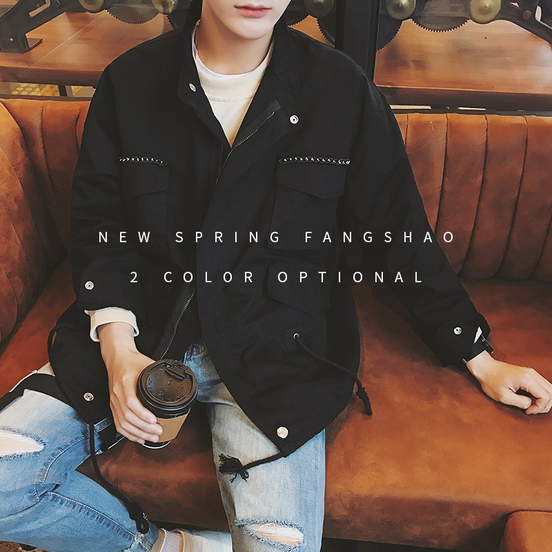 / 男裝17新款復古鐵鏈鑲邊男士寬松立領春季夾克外套