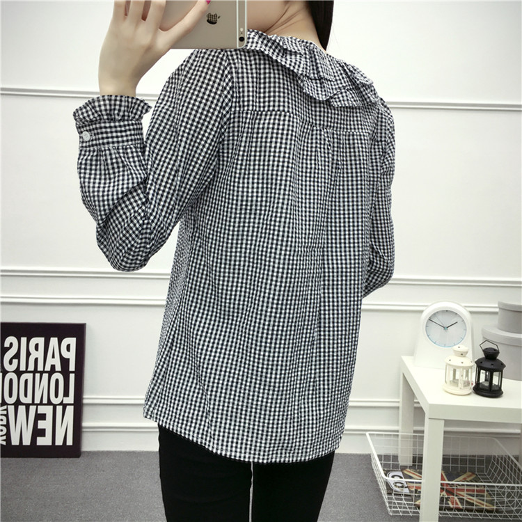 / 春秋新款女裝娃娃領格子荷葉邊長袖寬松顯瘦學院風襯衫襯衣上衣女
