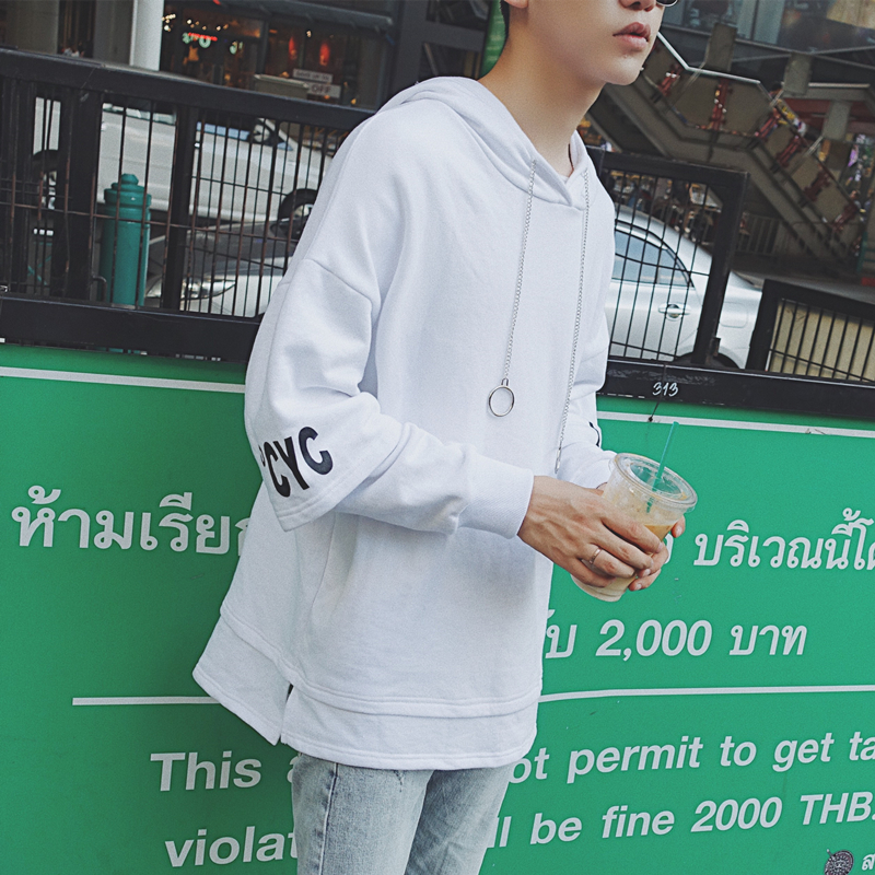 男裝韓版連帽印花假兩件袖男士寬松衛衣外套運動衫