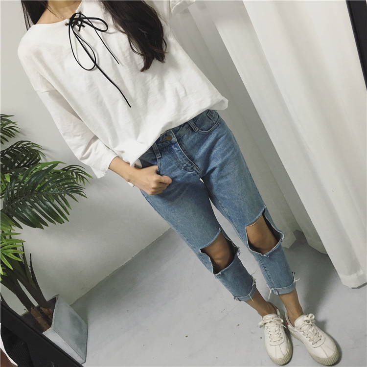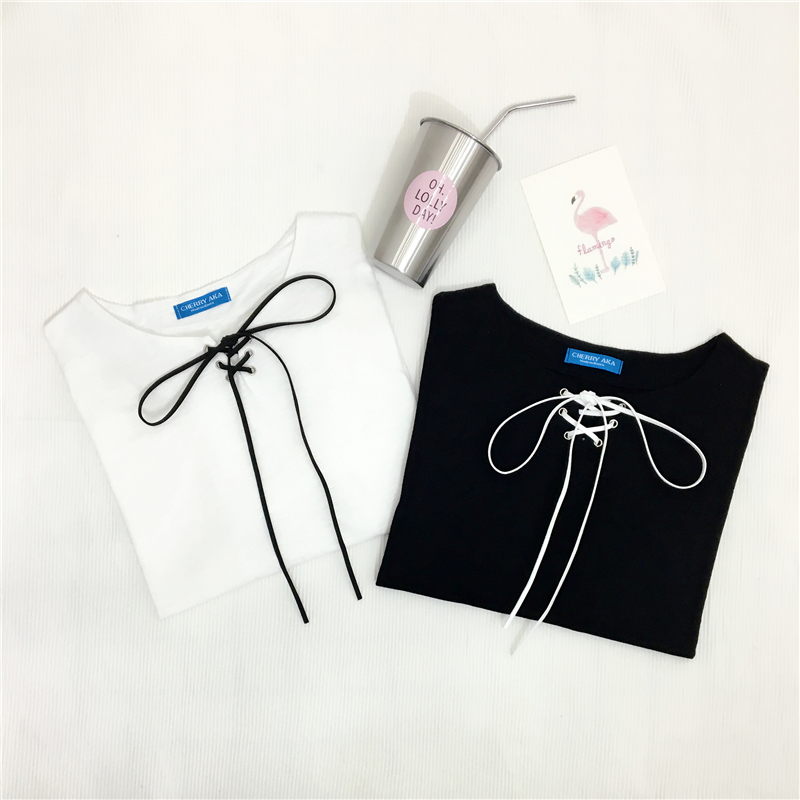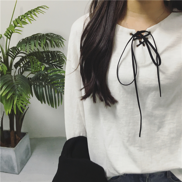 / 秋裝新款韓版寬松顯瘦上衣百搭休閑套頭綁帶七分袖T恤女裝潮