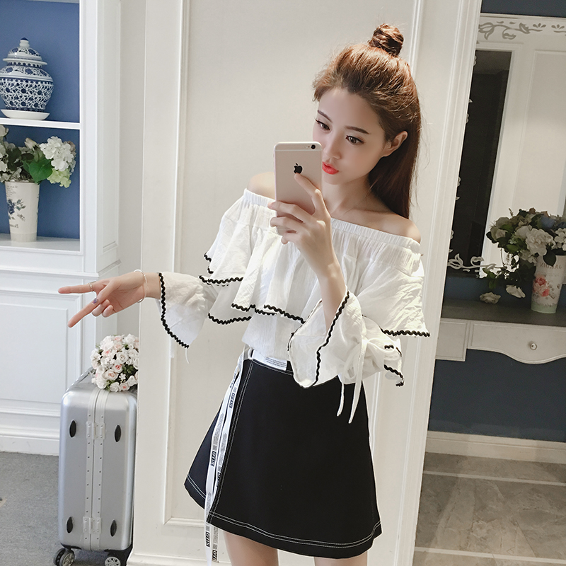 / 春夏新款韓版名媛氣質一字領雪紡衫套裝女高腰半身短裙兩件套