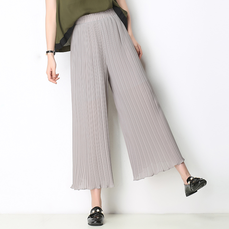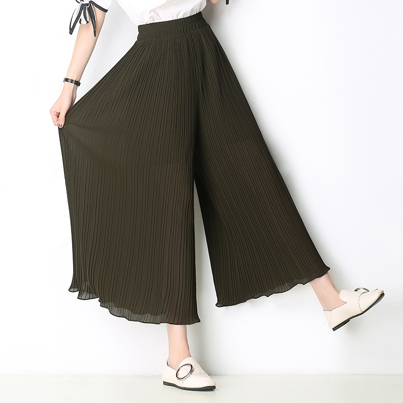 / 百褶闊腿褲女夏季新款韓版寬松顯瘦高腰松緊腰九分雪紡闊腿褲