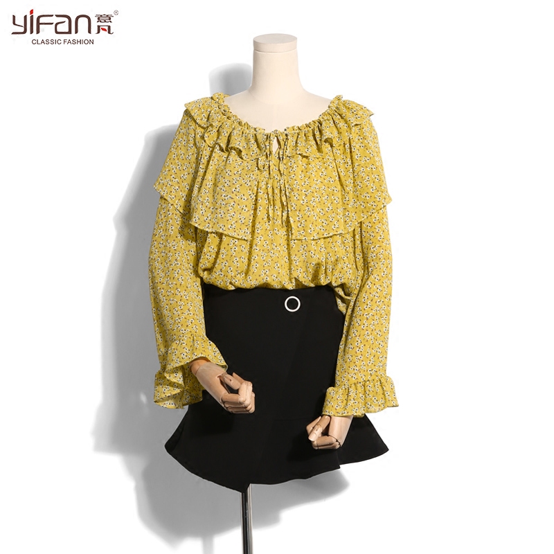/ 荷葉邊印花氣質碎花雪紡衫女春夏新款喇叭袖一字領上衣娃娃衫