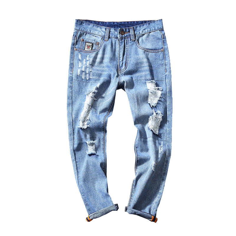 男裝韓版淺色水洗破洞男士修身小腳牛仔褲九分褲