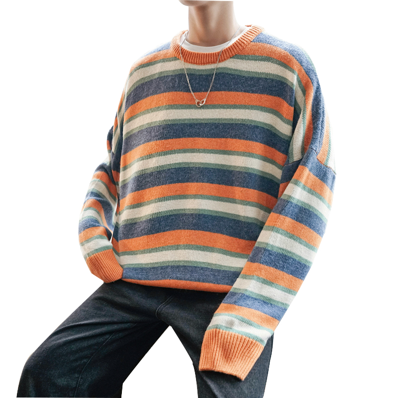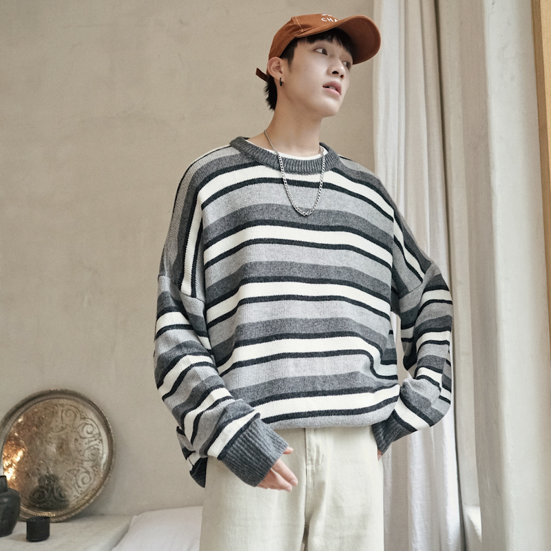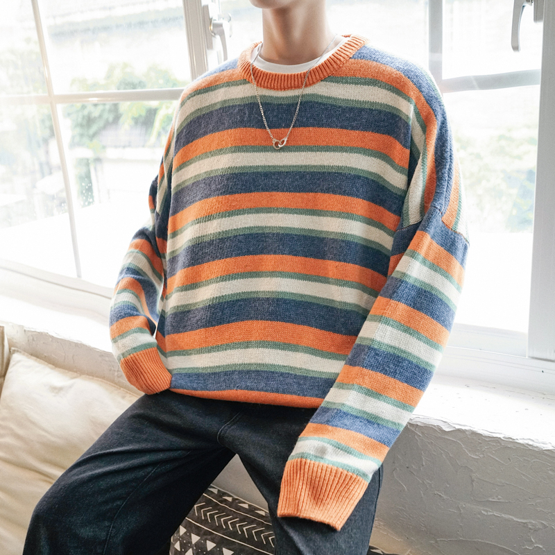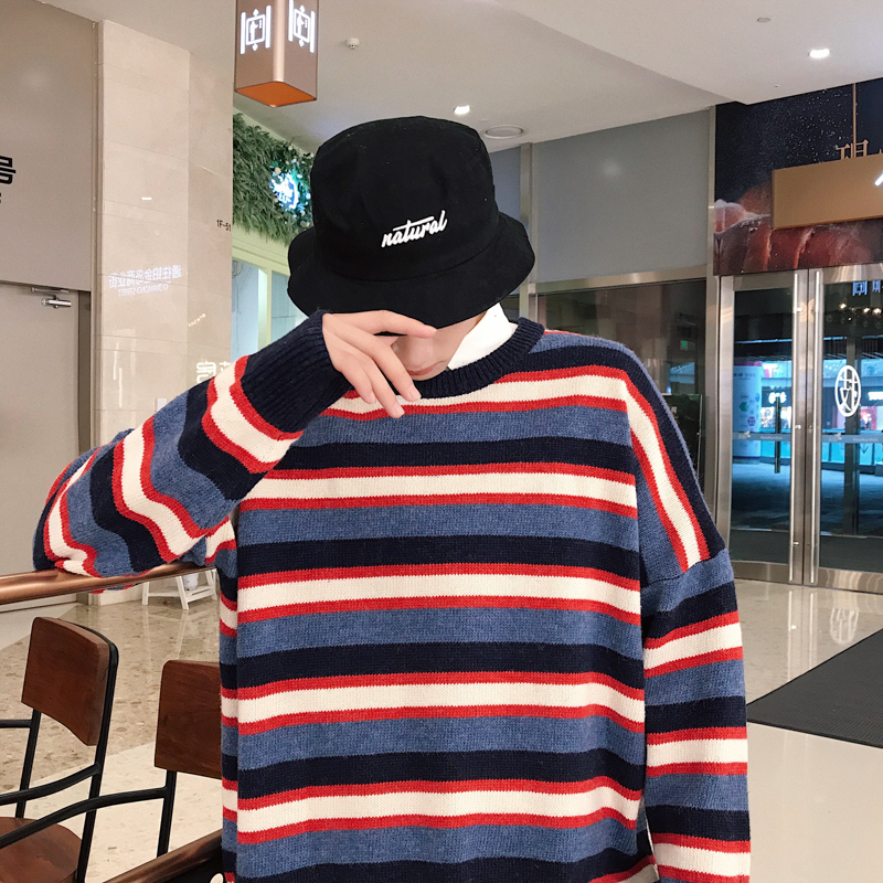 / 文藝男女店潮流寬松男士秋季圓領毛衣新款韓版條紋針織衫男裝線衣