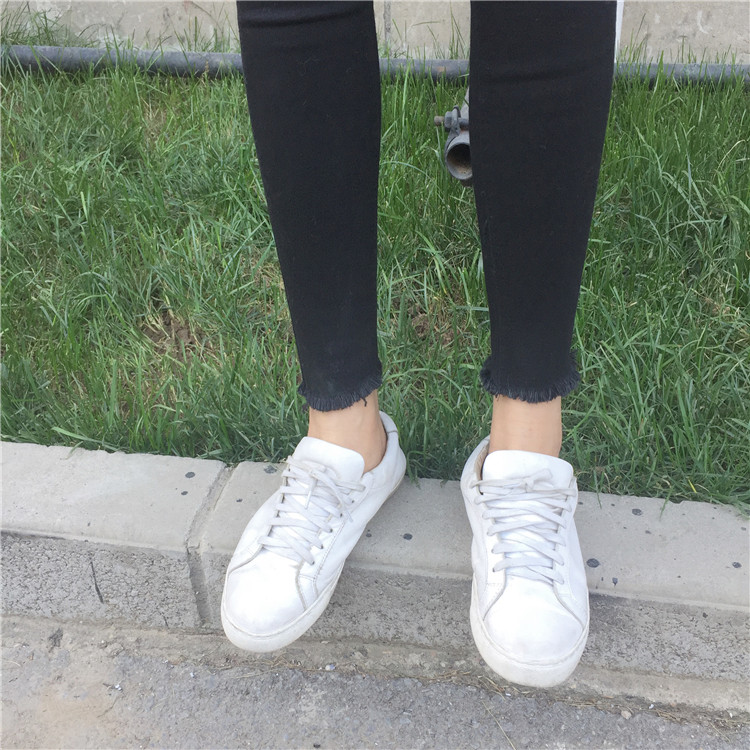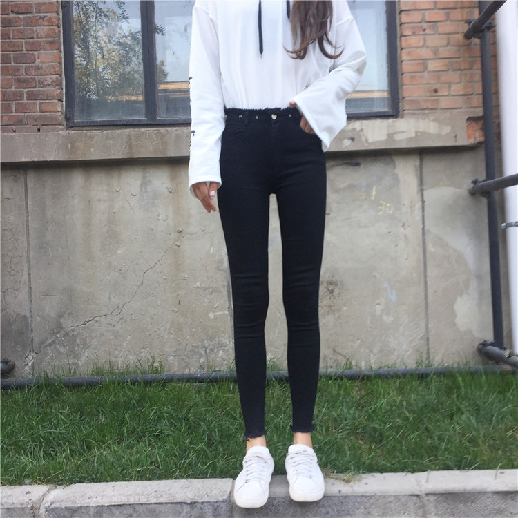 韓國秋冬高腰圓孔褲腳毛邊顯瘦黑色牛仔褲九分褲女小腳鉛筆褲