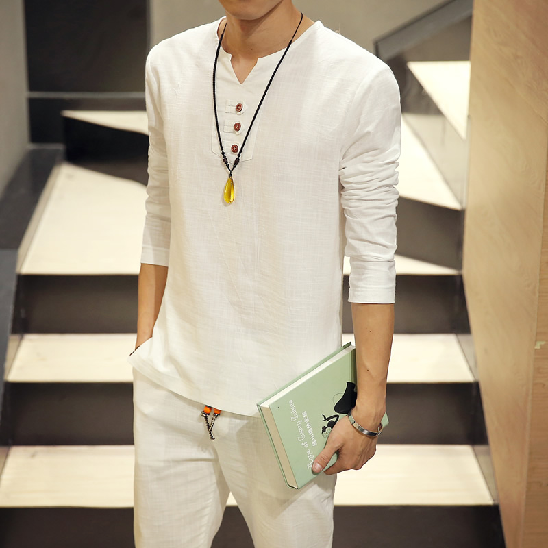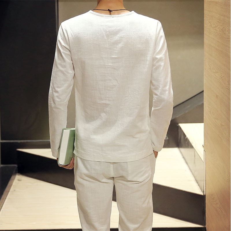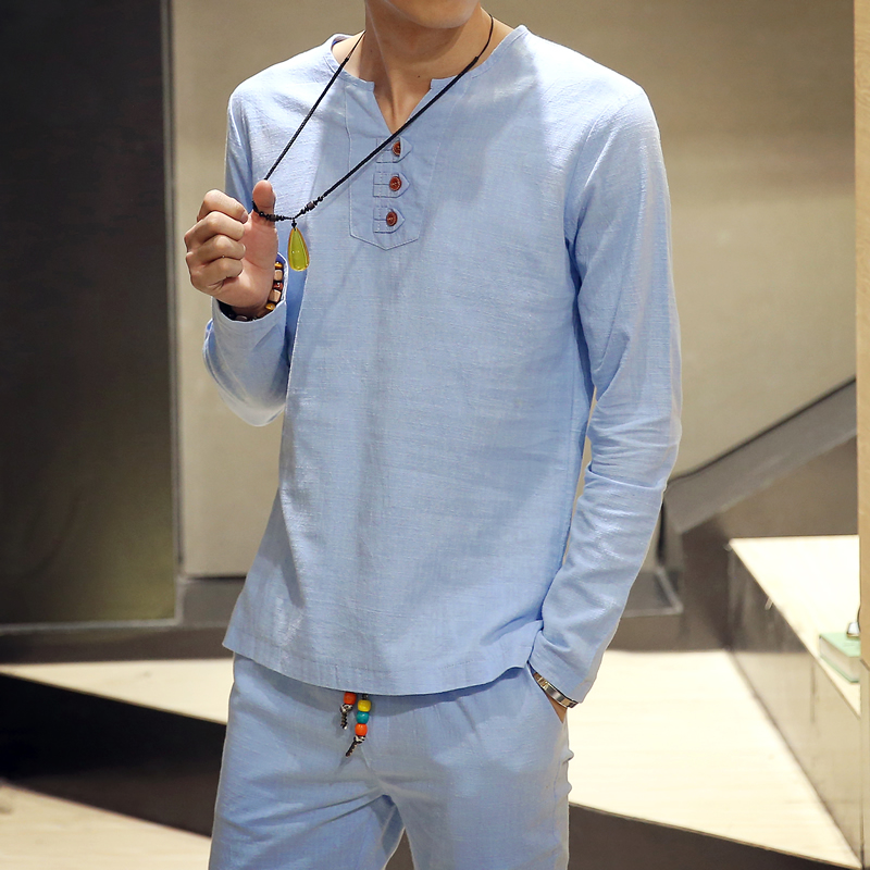 / 2017秋裝新款潮流休閑時尚 V領長袖棉麻T恤大碼男