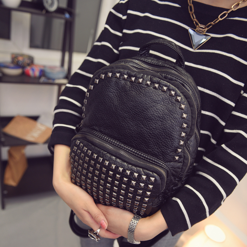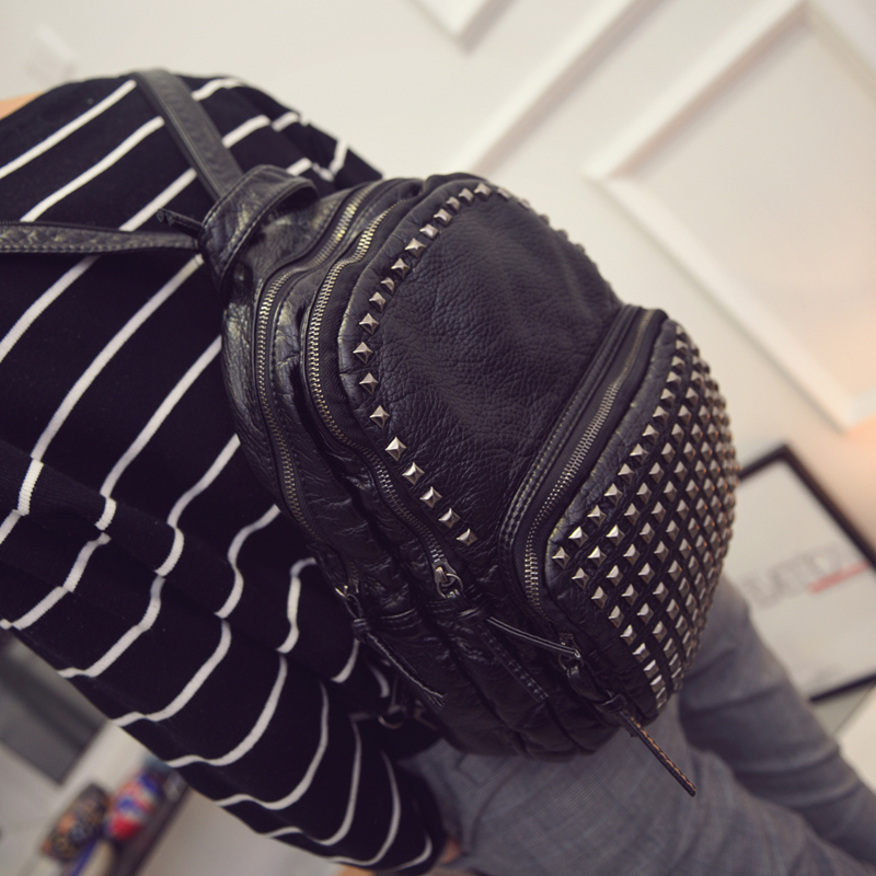 新款鉚釘雙肩包女韓版學院風旅行包書包胸包兩用水洗皮背包潮