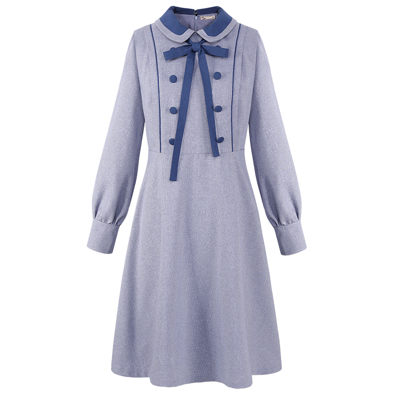 MG小象港味復古連衣裙女中長款秋冬新款寬松蝴蝶結長袖氣質裙子潮