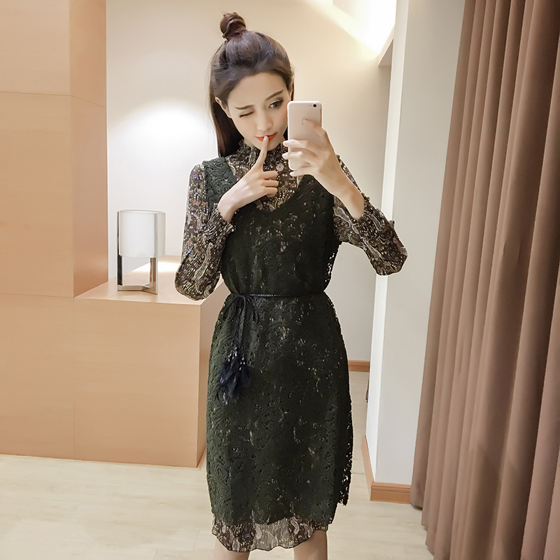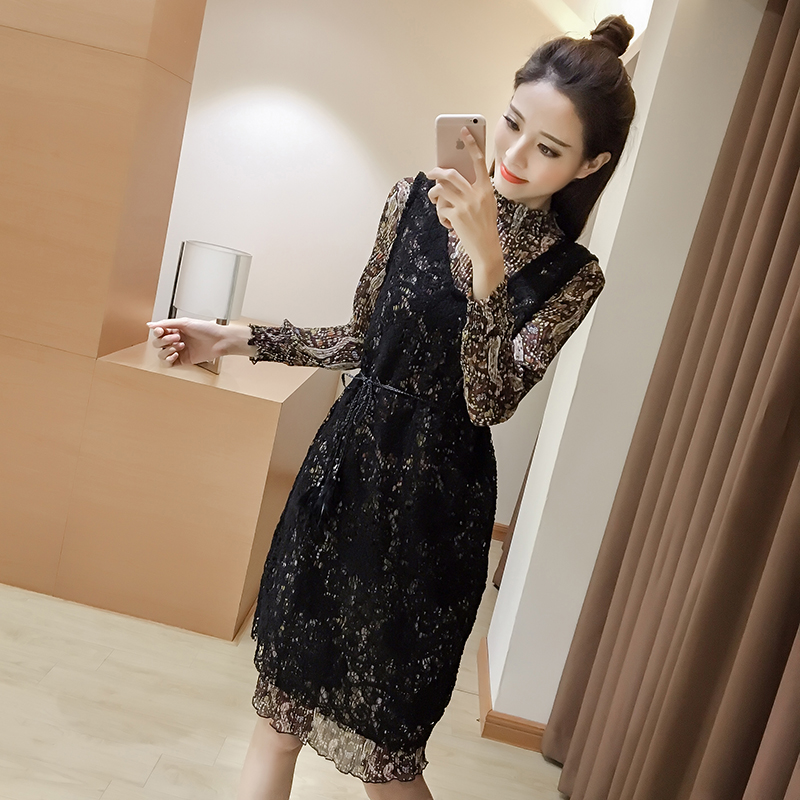 新款女裝蕾絲背帶裙兩件套女中長款顯瘦復古碎花長袖連衣裙春