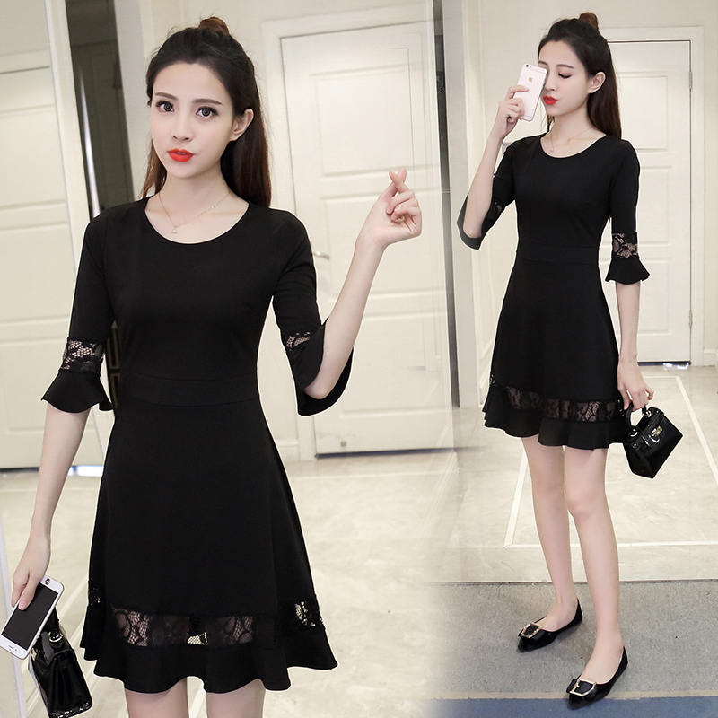 / 新款女裝韓版蕾絲拼接喇叭袖打底裙修身顯瘦七分袖連衣裙春秋