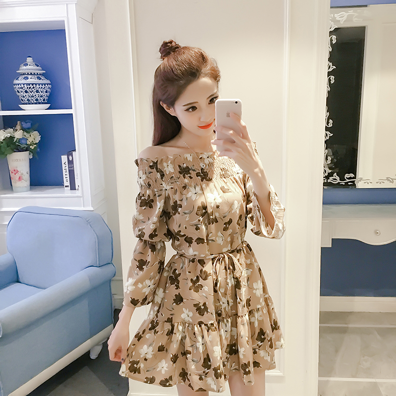 春裝新款女裝復古印花一字領打底裙修身收腰碎花雪紡連衣裙潮