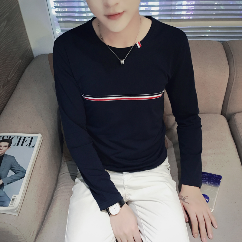 青年春季男士長袖t恤圓領修身大碼印花打底衫上衣服男