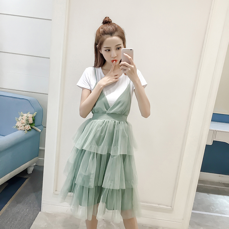 夏季新款女裝韓版網紗吊帶裙兩件套中長款顯瘦短袖蓬蓬連衣裙